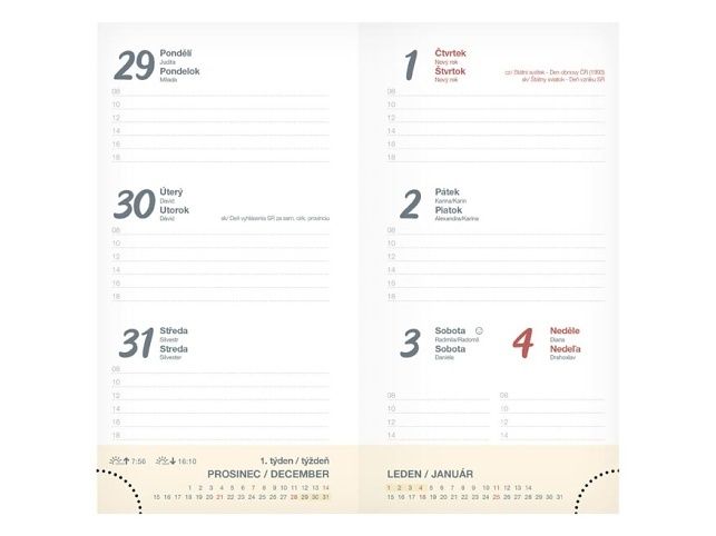 Plánujte s lehkostí! Růžový týdenní diář pro rok 2026 zaujme jemným květinovým motivem a elegantní obálkou z matného lamina s parciálním lakem, který decentně zvýrazňuje detaily. Kombinace tlumených tónů růžové a leskle lakovaných prvků vytváří harmonický, něžný a přitom moderní vzhled. Povrch je příjemný na dotek, odolný vůči každodennímu používání a ideální do kabelky, na pracovní stůl i jako dárek. Diář, který propojuje krásu s funkčností a přináší vašim plánům stylový prostor. DIÁŘ OBSAHUJE: - roční přehled roku - plánovací kalendář - čvrrtletní plánovací kalendář - abecední seznam jmen - státní svátky - mezinárodní svátky - 7 stran pro poznámky - mapy - jmenné kalendárium - číslování týdnů - státní svátky a významné dny - východy a západy Slunce - fáze měsíce - letní a zimní čas - znamení - přehled dvou měsícůzkus ještě jinak tu větu o povrchu Vazba: šitá V8 Motiv: květinový Rozsah: 128 stran Rozměr: 90 × 170 mm Kalendárium: československé týdenní Povrchy a zpracování obálky: matné lamino s parciálním lakem Uvedená cena je za 1 ks.