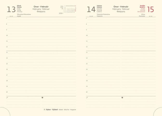 Diář obsahuje: osobní údaje, plánovač dovolené (měsíční přehled), plánovací kalendář, telefonní předvolby, státní svátky České a Slovenské republiky, mezinárodní svátky, roční výhled, denní layout, adresář, mapa Evropy a České a Slovenské republiky