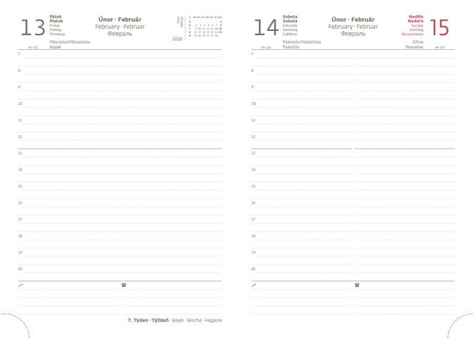 Diář obsahuje: osobní údaje, plánovač dovolené (měsíční přehled), plánovací kalendář, telefonní předvolby, státní svátky České a Slovenské republiky, mezinárodní svátky, roční výhled, denní layout, adresář, mapa Evropy a České a Slovenské republiky
