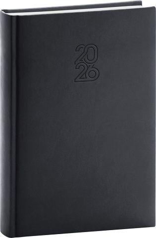 Denní diář Aprint 2026 v černé barvě. Kolekce vsadila na osvědčené barvy, které doplňuje nová ražba letopočtu. Denní rozvrh s česko-slovenským kalendáriem a doplňkovou angličtinou, němčinou, maďarštinou a ruštinou.