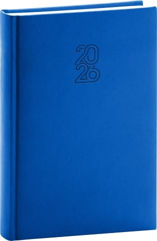 Denní diář Aprint 2026 v modré barvě. Kolekce vsadila na osvědčené barvy, které doplňuje nová ražba letopočtu. Denní rozvrh s česko-slovenským kalendáriem a doplňkovou angličtinou, němčinou, maďarštinou a ruštinou.
