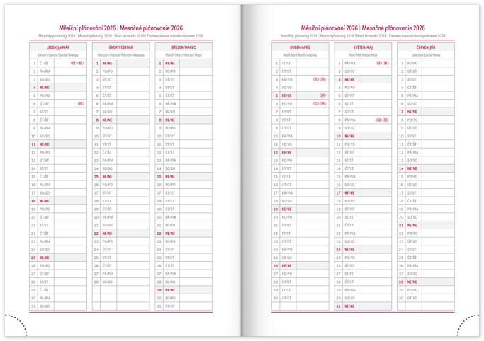kalendárium od prosince 2025 měsíční plánovací kalendář 2026 měsíční plánovací kalendář 2027 roční plánovací kalendář 2026–2027 pracovní plánovací kalendář svátky České a Slovenské republiky a mezinárodní svátky rozšířený seznam českých jmen mapa České a Slovenské republiky místo pro osobní údaje textilní záložka perforované růžky prostor pro poznámky