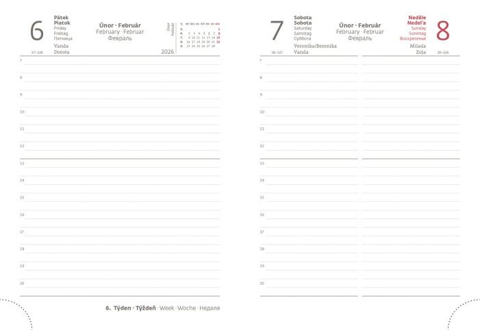 Diář obsahuje: osobní údaje, plánovač dovolené (měsíční přehled), plánovací kalendář, telefonní předvolby, státní svátky České a Slovenské republiky, mezinárodní svátky, roční výhled, denní layout, adresář, mapa Evropy a České a Slovenské republiky