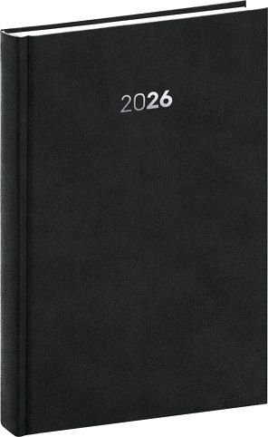 Plánovací denní diář Balakon 2026 v černém provedení, doplněný o stříbrný letopočet. Povrch diáře si získal oblibu díky kvalitnímu svrchnímu materiálu, který je extrémně odolný vůči vnějšímu poškození. Denní rozvrh s česko-slovenským kalendáriem a doplňkovou angličtinou, němčinou, maďarštinou a ruštinou.