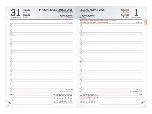 Přirozený vzhled, příjemný na dotek! Denní diář na rok 2026 ve formátu A5 zaujme na první pohled svým neobvyklým povrchem imitujícím přírodní korek. Tento materiál působí moderně a originálně, zároveň dodává diáři osobitý a přirozený vzhled. Příjemná textura (PU) obálky zajišťuje komfort při každodenním používání. Kompaktní velikost z něj dělá ideálního společníka do práce i na cesty. Nechybí ani odtrhávací rožky, které vám umožní rychle najít aktuální den bez zbytečného listování. Každý den nabízí dostatek prostoru pro Vaše plány, schůzky i nápady. DIÁŘ OBSAHUJE: - roční přehled roku - plánovací kalendář - čtvrtletní plánovací kalendář - abecední seznam jmen - státní svátky - mezinárodní svátky - 7 stran pro poznámky - mapy - jmenné kalendárium - číslování týdnů - státní svátky a významné dny - východy a západy Slunce - fáze měsíce - letní a zimní čas - znamení - přehled dvou měsíců Barva: hnědá Vazba: šitá V8 Rozsah: 336 stran Motiv: imitace korku Rozměr: 140 x 205 mm Kalendárium: československé denní Povrchy a zpracování obálky: PU soft Uvedená cena je za 1 ks.