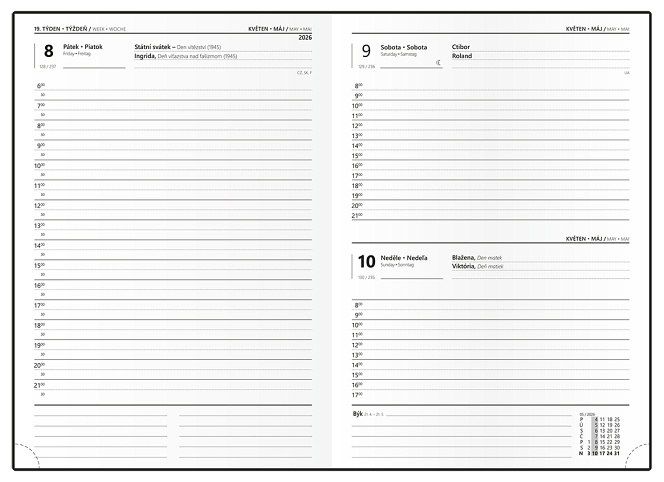 Informační stránky obsahují: osobní údaje, přehledný kalendář aktuálního roku a následujícího roku, měsíční plánování aktuálního roku, plán dovolených aktuálního roku, přehled státních svátků a významných dnů CZ/SK, jmenný seznam CZ/SK, daňový kalendář CZ/SK aktuálního roku, mezinárodní svátky, důležitá telefonní čísla, roční plánovací kalendář CZ/SK aktuálního roku, místo pro poznámky, mapa CZ/SK, zadní předsádka - kapsa