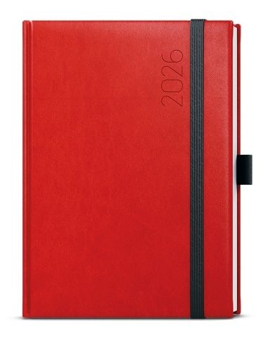 Denní diář v červené barvě z jemné vivelly ve formátu A5 s praktickou gumičkou a poutkem na propisku. Má velký prostor pro poznámky a plánování.
