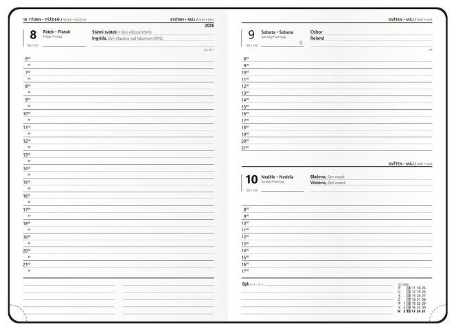 Informační stránky obsahují: osobní údaje, přehledný kalendář aktuálního roku a následujícího roku, měsíční plánování aktuálního roku, plán dovolených aktuálního roku, přehled státních svátků a významných dnů CZ/SK, jmenný seznam CZ/SK, daňový kalendář CZ/SK aktuálního roku, mezinárodní svátky, důležitá telefonní čísla, roční plánovací kalendář CZ/SK aktuálního roku, místo pro poznámky, mapa CZ/SK, zadní předsádka - kapsa