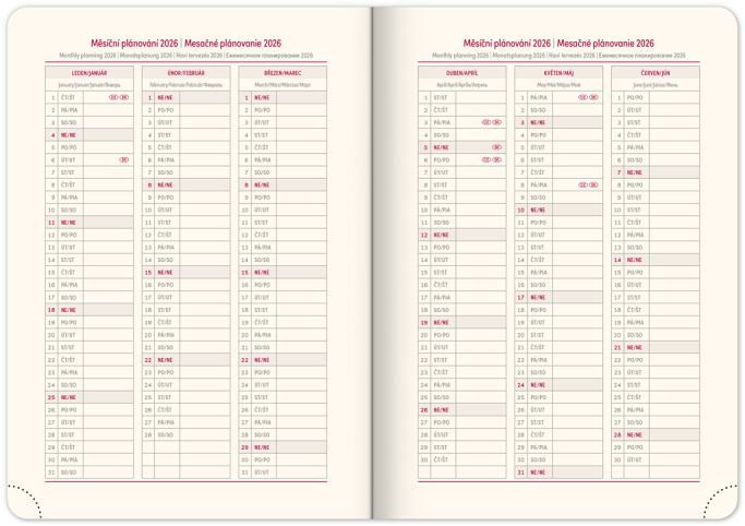 kalendárium od prosince 2025 měsíční plánovací kalendář 2026 měsíční plánovací kalendář 2027 roční plánovací kalendář 2026–2027 pracovní plánovací kalendář svátky České a Slovenské republiky a mezinárodní svátky rozšířený seznam českých jmen mapa České a Slovenské republiky místo pro osobní údaje textilní záložka perforované růžky prostor pro poznámky