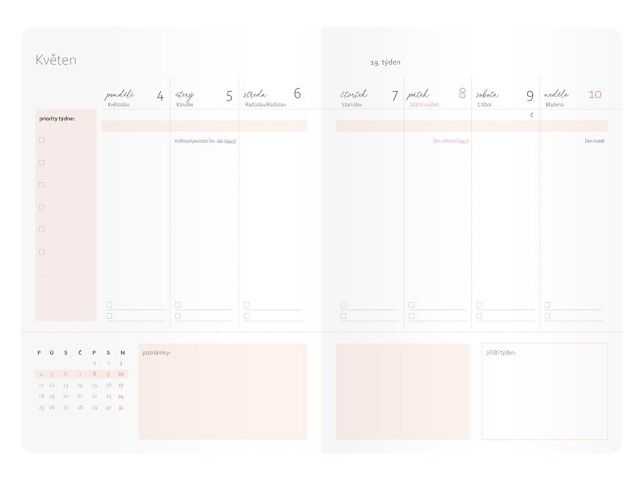 Nechte prostor svým myšlenkám! Inspirační diář pro rok 2026 v elegantní béžové barvě působí klidně a vyrovnaně – a přesně takový může být i váš rok. Matná PU obálka je příjemná na dotek, zlatý motiv dodává jemný akcent. Praktická gumička udržuje diář zavřený, když zrovna nechcete řešit vůbec nic. Formát A5 je ideální na pracovní stůl, do kabelky i pro chvíle jen s tužkou a vlastními myšlenkami. V diáři najdete přehledné české týdenní kalendárium, kvalitní jemný papír a stránky, které nejsou jen o úkolech – ale také o vás. Citáty, prostor pro psaní, plánování, zpomalení i drobnou kreativitu. DIÁŘ OBSAHUJE: - záložky pro pohodlnou organizaci - archy se samolepkami - lekce krasopsaní - prostor pro plánování - roční přehled roku - jmenné kalendárium - měsíční plán - státní svátky a významné dny - fáze měsíce - letní a zimní čas - znamení - přehled měsíce - prostor pro poznámky a týdenní cíle Formát: A5 Vazba: šitá V8 Barva: béžová Papír: 100 g/m2 Počet stran: 240 Kalendárium: týdenní Rozměr: 140 x 205 mm Povrch a zpracování obálky: PU Uvedená cena je za 1 ks.