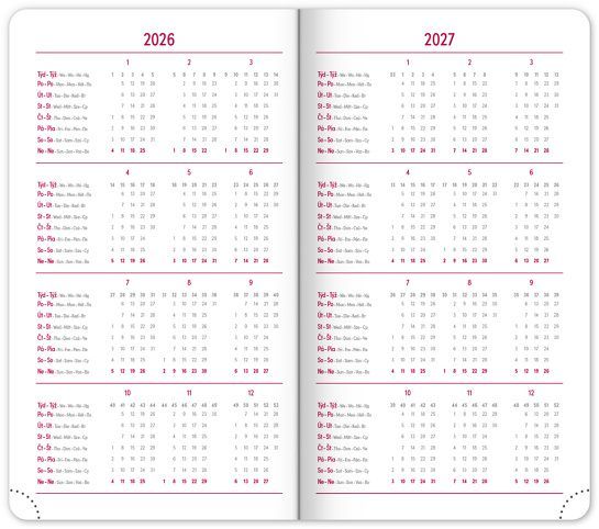 kalendárium od prosince 2025 roční plánovací kalendář 2026–2027 pracovní plánovací kalendář svátky České a Slovenské republiky a mezinárodní svátky rozšířený seznam českých jmen místo pro osobní údaje perforované růžky prostor pro poznámky
