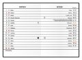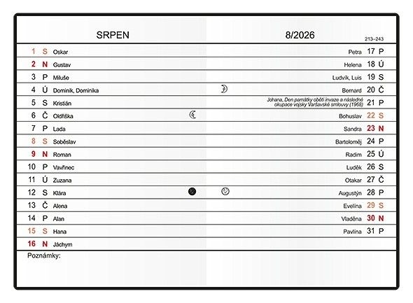 Informační stránky obsahují: osobní záznamy, důležitá telefonní čísla, tabulkový kalendář aktuálního roku a následujícího roku, jmenný seznam, místo na poznámky