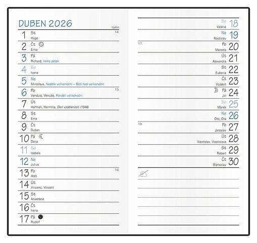Informace o kalendáriu: měsíční fáze, roční období, letní a zimní čas, prostor na poznámky