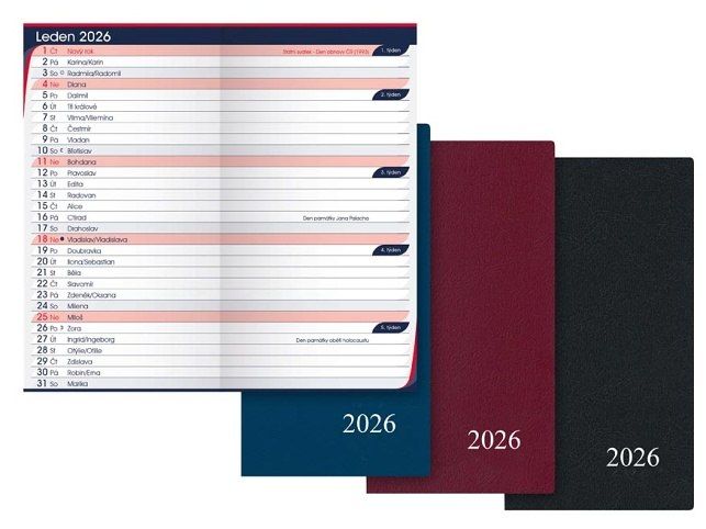 Rychlý přehled! Měsíční diář 2026 nabízí ideální způsob, jak mít celý měsíc přehledně na jednom místě. Každý měsíc je zobrazen na dvoustraně, což umožňuje rychlý přehled a dostatek místa pro zápisky, úkoly a poznámky. PVC obálka v praktických barvách (modrá, červená, černá) zajišťuje dlouhou životnost a odolnost proti každodennímu nošení. Díky kompaktnímu formátu je tento diář ideální pro rychlé záznamy na cestách, v práci i doma. DIÁŘ OBSAHUJE: - plánovací kalendář - prostor pro ordinační a úřední hodiny - roční přehled roku - mezinárodní svátky - abecední seznam jmen -3 strany pro poznámky - mapa ČR - jmenné kalendárium - číslování týdnů - státní svátky a významné dny - pracovní dny a hodiny - fáze měsíce - letní a zimní čas Počet stran: 48 Vazba: sešitová V1 Kalendárium: měsíční Rozměr: 80 x 150 mm Barva: modrá, bordó, černá Povrch a zpracování obálky: PVC Uvedená cena je za 1 ks.