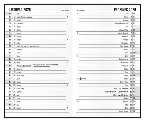 Vazba/obálka/karton: jemný hladký materiál PVC, potisk roku bílou barvou, šitá vazba V1