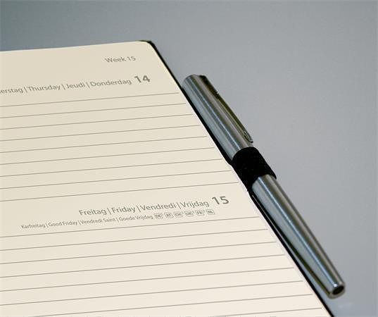 Stylový diář je uzavíratelný na gumičku, vybavený praktickou papírovou kapsou na zadní straně a poutkem na pero. Jazyk: D/GB/F/NL (ne v CZ)