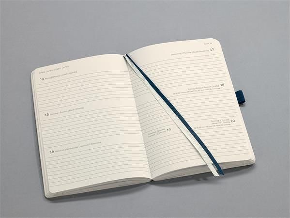 Stylový diář je uzavíratelný na gumičku, vybavený praktickou papírovou kapsou na zadní straně a poutkem na pero. Jazyk: D/GB/F/NL (ne v CZ)