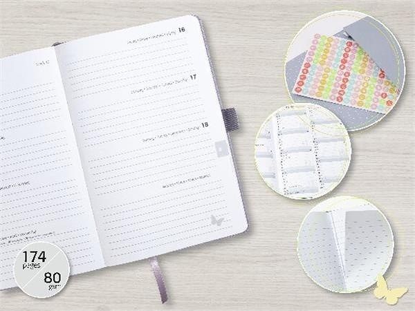 Vlastnosti: měsíční a roční přehledy (pouze EN) , svátky a státní svátky (DE, AT, CH, UK, FR, BE, NL), záložka se stuhou, arch se samolepkami