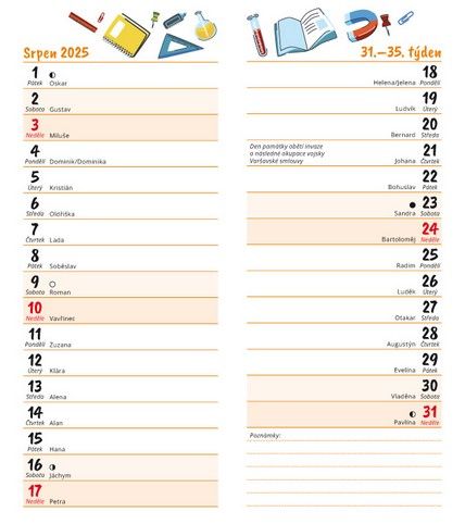 počet stran 32. Kalendárium: měsíční kalendárium, fáze měsíce. Informační stránky: rozvrh hodin, tabulkové kalendáře 2025 a 2026, seznam jmen, termíny prázdnin