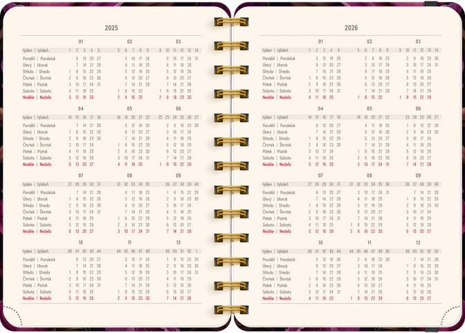 Osmnáctiměsíční diář obsahuje přehled na rok 2025 a 2026, seznam českých a slovenských jmen, česko-slovenské týdenní řádkové kalendárium se jmény a svátky a prostor na poznámky. Kalendárium začíná v červenci 2025 a končí v prosinci 2026.