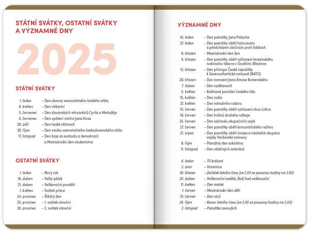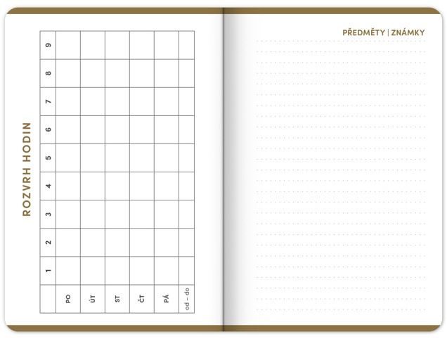 Studentský diář v minimalistickém černém designu obsahuje přehled na rok 2025 a 2026, české týdenní řádkové kalendárium se jmény a svátky, rozvrh hodin, prostor na poznámky a základní poznatky z matematiky, fyziky, chemie a angličtiny pro studenty. Kalendárium začíná v září 2025 a končí v prosinci 2026.