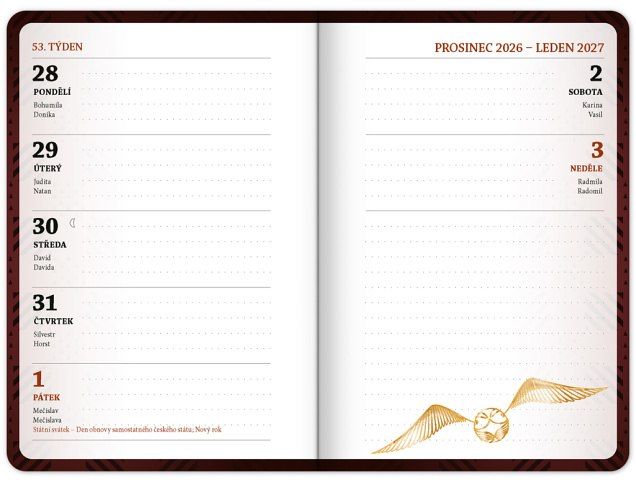 Praktický diář pro všechny větší školáky a studenty s motivem Harryho Pottera. Obsahuje taháky z matematiky, fyziky, chemie a angličtiny. Hodit se budou také rozvrhy hodin a přehled termínů prázdnin.