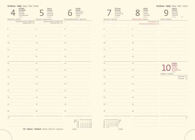 Diář obsahuje: osobní údaje, plánovač dovolené (měsíční přehled), plánovací kalendář, telefonní předvolby, státní svátky České a Slovenské republiky, mezinárodní svátky, roční výhled, týdenní layout, adresář, mapa Evropy a České a Slovenské republiky