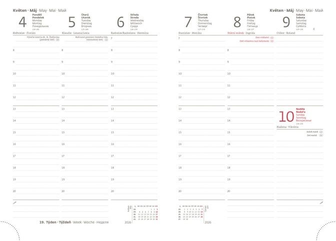 Diář obsahuje: osobní údaje, plánovač dovolené (měsíční přehled), plánovací kalendář, telefonní předvolby, státní svátky České a Slovenské republiky, mezinárodní svátky, roční výhled, týdenní layout, adresář, mapa Evropy a České a Slovenské republiky