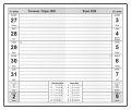 Informační stránky obsahují: osobní záznamy, důležitá telefonní čísla, čtvrtletní plánovací kalendář aktuálního roku, tabulkový kalendář následujícího roku, jmenný seznam, místo na poznámky, roční plánovací kalendář aktuálního roku