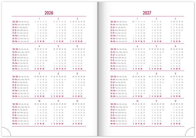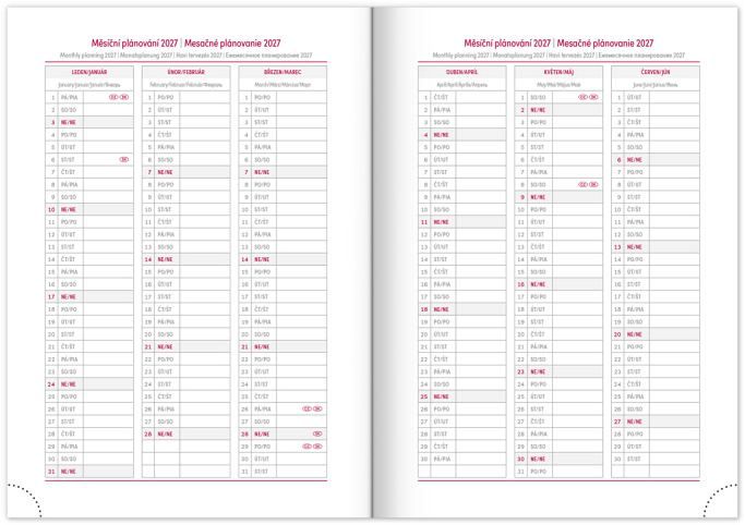 kalendárium od prosince 2025 měsíční plánovací kalendář 2026 měsíční plánovací kalendář 2027 roční plánovací kalendář 2026–2027 pracovní plánovací kalendář svátky České a Slovenské republiky a mezinárodní svátky rozšířený seznam českých jmen mapa České a Slovenské republiky místo pro osobní údaje textilní záložka perforované růžky prostor pro poznámky.