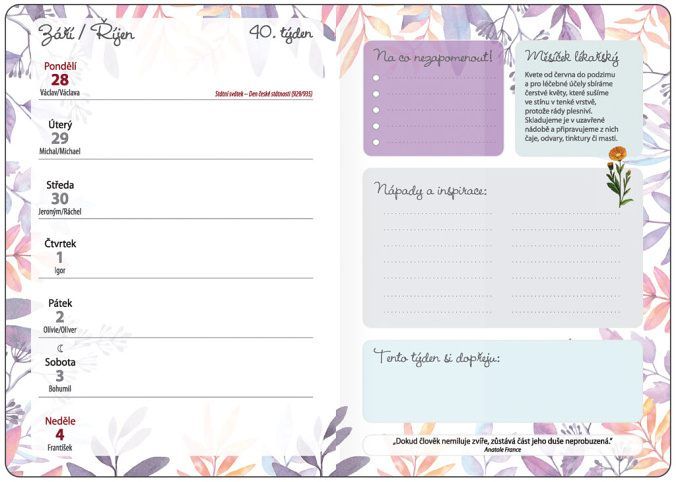 Bylinkový diář Elegantní barevný diář s popisem účinků a použití vybraných bylinek na každý měsíc, citátem na každý týden a prostorem pro poznámky, nápady a inspiraci. Desky jsou vyrobeny z matného lamina s oblíbeným hedvábným povrchem soft touch. Diáře jsou doplněny gumičkou přes hřbet, záložkou a třemi aršíky kreativních samolepek.