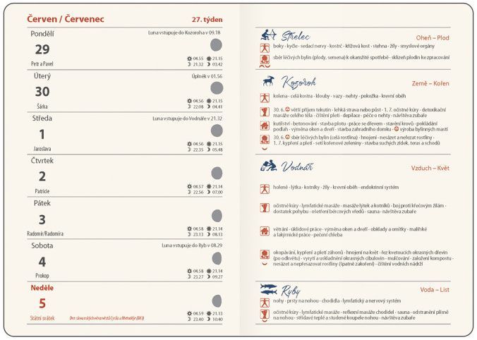 Lunární diář Diář orientovaný na praktické rady, podle kterých se můžete řídit během lunárního cyklu a s informacemi týkajícími se péče o tělo, domácnost, kutilství a zahradu. Desky jsou vyrobeny z matného lamina s oblíbeným hedvábným povrchem soft touch. Diáře jsou doplněny gumičkou přes hřbet, záložkou a třemi aršíky kreativních samolepek.