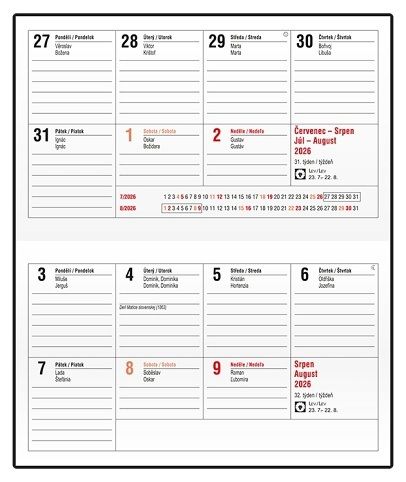 Informační stránky obsahují: osobní záznamy, důležitá telefonní čísla, čtvrtletní plánovací kalendář aktuálního roku CZ/SK, roční plánovací kalendář aktuálního roku CZ/SK, tabulkový kalendář následujícího roku CZ/SK, jmenný seznam CZ/SK, místo na poznámky