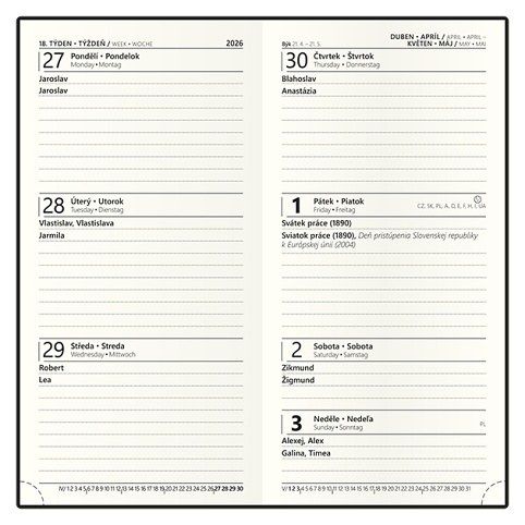 Informační stránky obsahují: osobní údaje, přehledný kalendář aktuálního roku a následujícího roku, měsíční plánování aktuálního roku, plán dovolených aktuálního roku, jmenný seznam CZ/SK, mezinárodní svátky, roční plánovací kalendář CZ aktuálního roku, místo pro poznámky