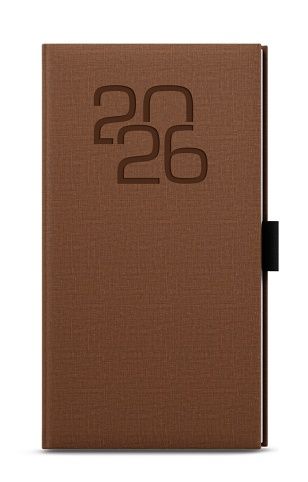 Kapesní týdenní diář z příjemného materiálu v hnědé barvě a s moderní ražbou roku. Trendy a praktický doplněk do každé kapsy. Diář má velký prostor pro poznámky a plánování.