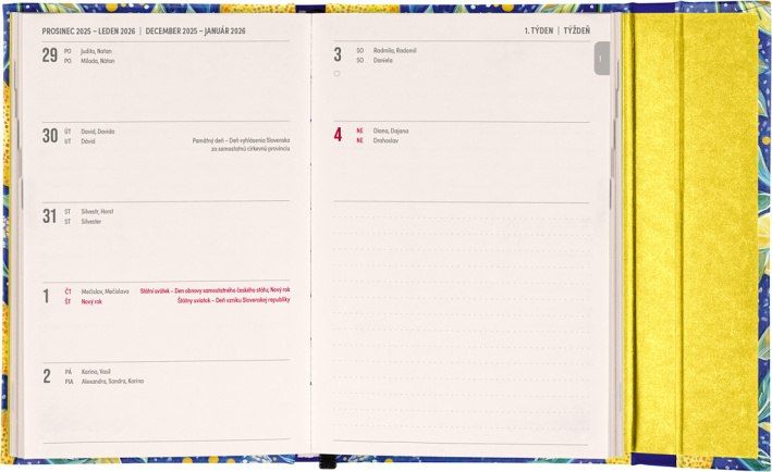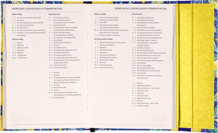 Týdenní diář s praktickým magnetickým uzavíráním je ideální volbou pro ty, kteří chtějí mít své plány přehledně pod kontrolou. Horizontální rozložení s českým a slovenským kalendáriem ve verzi týden na dvou stranách s prostorem pro poznámky. Součástí jsou praktické měsíční přehledy, ideální pro plánování dovolených či prázdnin, a také seznam českých a slovenských svátků a jmenin.