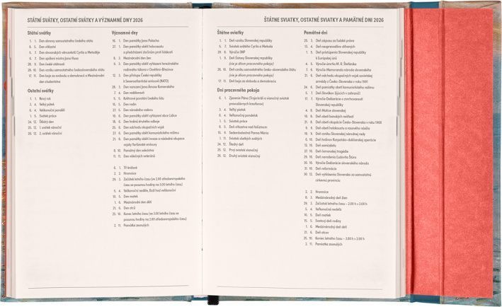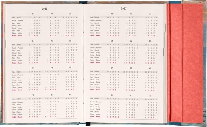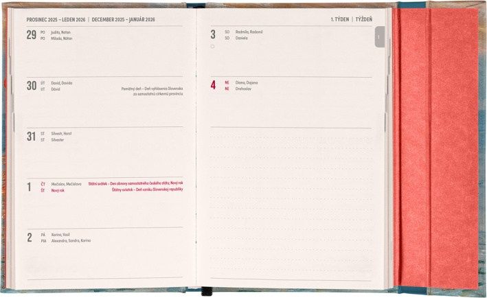 Týdenní diář s praktickým magnetickým uzavíráním je ideální volbou pro ty, kteří chtějí mít své plány přehledně pod kontrolou. Horizontální rozložení s českým a slovenským kalendáriem ve verzi týden na dvou stranách s prostorem pro poznámky. Součástí jsou praktické měsíční přehledy, ideální pro plánování dovolených či prázdnin, a také seznam českých a slovenských svátků a jmenin.