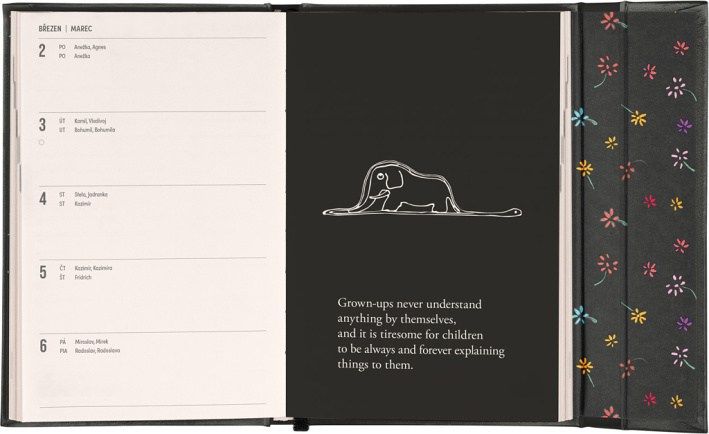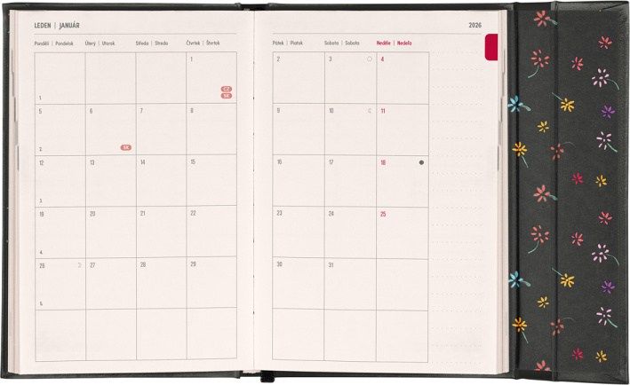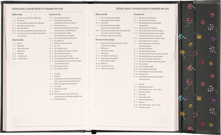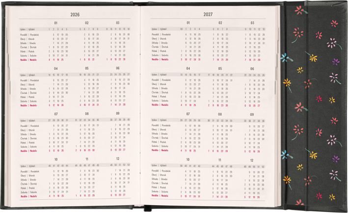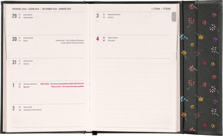 Týdenní diář s praktickým magnetickým uzavíráním je ideální volbou pro ty, kteří chtějí mít své plány přehledně pod kontrolou. Horizontální rozložení s českým a slovenským kalendáriem ve verzi týden na dvou stranách s prostorem pro poznámky. Součástí jsou praktické měsíční přehledy, ideální pro plánování dovolených či prázdnin, a také seznam českých a slovenských svátků a jmenin.