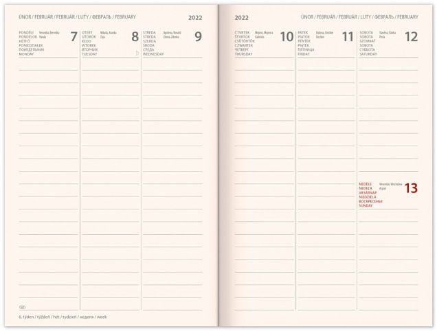 Šestijazyčný týdenní diář s magnetickým uzavíráním obsahuje přehled mezinárodních svátků, seznam českých a slovenských jmen, přehled roku 2022 a 2023, adresář a kapsičku na zadní předsádce. Sloupcové rozvržení s prostorem pro poznámky na každý den. Diář doplňují vesmírné motivy.