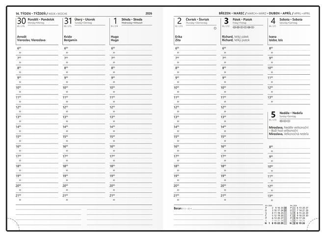 Informační stránky obsahují: osobní údaje, přehledný kalendář aktuálního roku a následujícího roku, měsíční plánování aktuálního roku, plán dovolených aktuálního roku, přehled státních svátků a významných dnů CZ/SK, jmenný seznam CZ/SK, daňový kalendář CZ/SK aktuálního roku, mezinárodní svátky, důležitá telefonní čísla, roční plánovací kalendář CZ/SK aktuálního roku, místo pro poznámky, mapa CZ/SK, zadní předsádka - kapsa