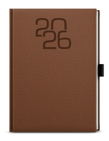 Týdenní diář hnědé barvy formátu A5 vyrobený ze zajímavého materiálu s moderní ražbou roku a poutkem na tužku.