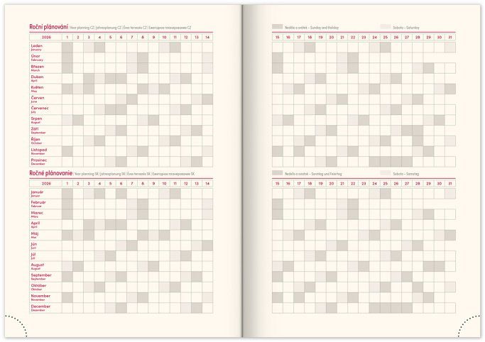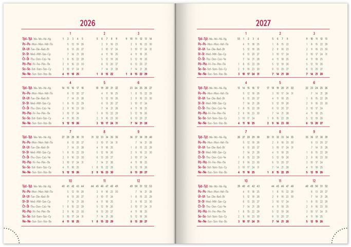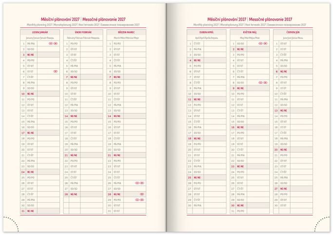 kalendárium od prosince 2025 měsíční plánovací kalendář 2026 měsíční plánovací kalendář 2027 roční plánovací kalendář 2026–2027 pracovní plánovací kalendář svátky České a Slovenské republiky a mezinárodní svátky rozšířený seznam českých jmen mapa České a Slovenské republiky místo pro osobní údaje textilní záložka perforované růžky prostor pro poznámky