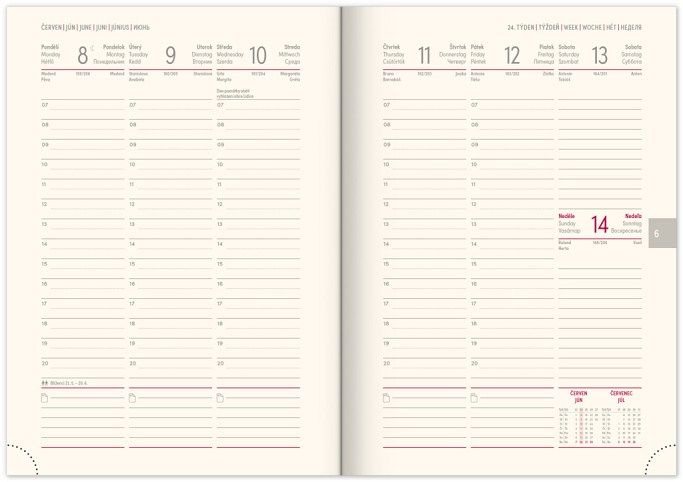 Nová řada diářů s výrazným letopočtem. Povrch má jemnou strukturu a je vhodný pro všechny typy ražeb. Týdenní rozložení s česko-slovenským kalendáriem a doplňkovou angličtinou, němčinou, maďarštinou a ruštinou.