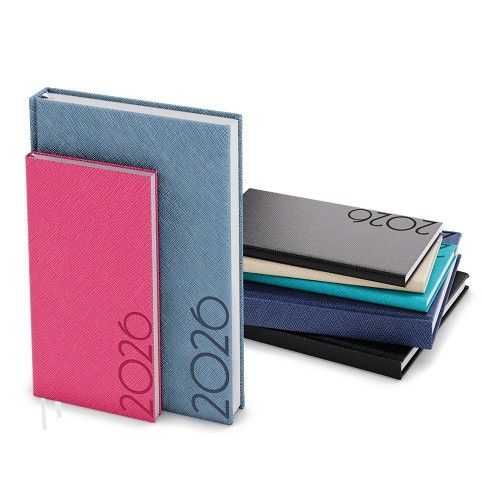 Diář s týdenním kalendáriem na jedné straně a na druhé straně s prostorem na poznámky. Desky jsou vyrobeny ze strukturovaného lesklého materiálu s jednostrannou pěnovou výplní a s kulatými rohy.