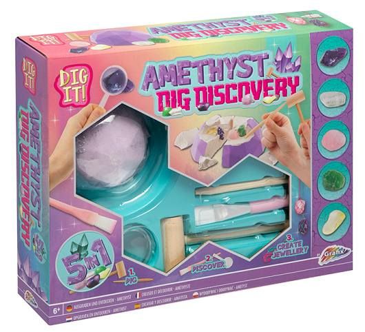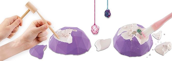 Vykopej 5 drahokamů, ale dej pozor, ať je nepoškodíš!! Opatrně pomocí dláta a paličky vykopávej drahokamy, očisti štětečkem a pak si z nich můžeš udělat přívěsky pomocí šňůrek, které najdeš v balení. Balení obsahuje: 5 zalisovaných drahokamů, dláto, palič