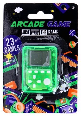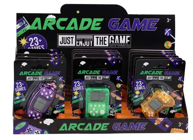 Digitální hra arkádová – Brickgame. 3 různé barvy/tvary: oranžová, zelená a fialová. Ve hře Brickgame si můžete zahrát více než 23 zábavných her. Na baterie: 2x LR41 (jsou součástí balení)