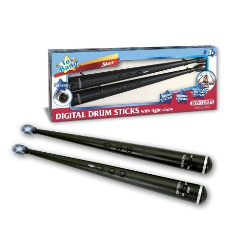 Digitální paličky na buben se světelnou show – aktivujete pohybem, hrají ve vzduchu a nebo při dotyku s povrchem. Přednastavené 3 bubnové melodie, 1 bubnový rytmus, reproduktor, světelné efekty.