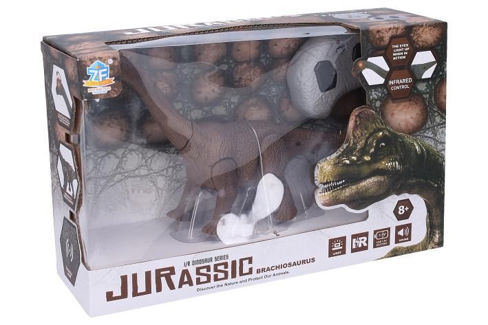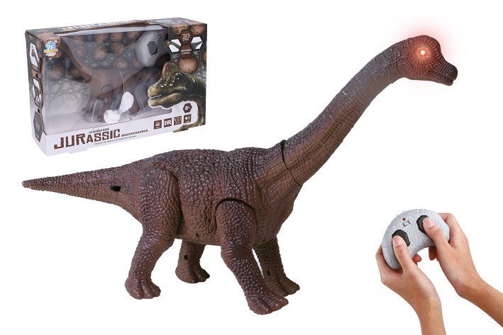 Dino Brachiosaurus RC na dálkové ovládání. Velikost 18 x 18 x 7,5 cm. IR ovladač. Svítící oči a otevírací tlama. Pohyb dopředu a dozadu. Výběr 3 frekvencí (A, B, C).