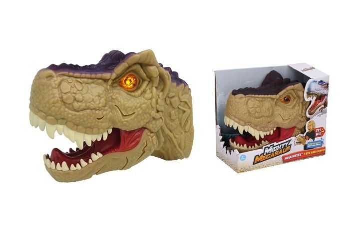 Dino hlava na ruku. Velikost 20cm. Zvukové a světelné efekty. Baterie 2xAAA součástí.