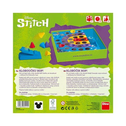 Kloboučku HOP! Oblíbená retro hra v novém designu populární licence Stitch. Lítejte vesmírem s nezbedným bláznivým Stitchem a jeho kamarádkou Angel a u toho potrénujte dobrou mušku, zručnost, motoriku i počítání. Každý klobouček v terči se počítá, a když se vám podaří umístit barvu kloboučku do stejné barvy v terči, máte dvojnásobek bodů. Díky stabilní odpalovací rampě zvládnou děti již od 4 let. Kdo trefí všechny kloboučky do terče? Zahrajte si sami, nebo poměřte své dovednosti s kamarády. Věk 4+